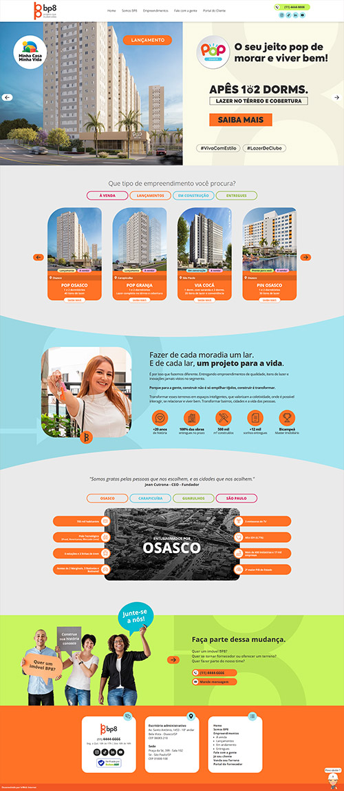 BP8 ConstrutoraAnteriormente chamada de Banco de Projetos, a BP8 é uma empresa de Osasco (SP) que faz a incorporação e construção de empreendimentos comerciais, como salas comerciais, hotéis, entre outros, além de condomínios residenciais. O site apresenta a empresa, mostra os empreendimentos construídos, formulários de contato, além de galeria de fotos do andamento de obras.