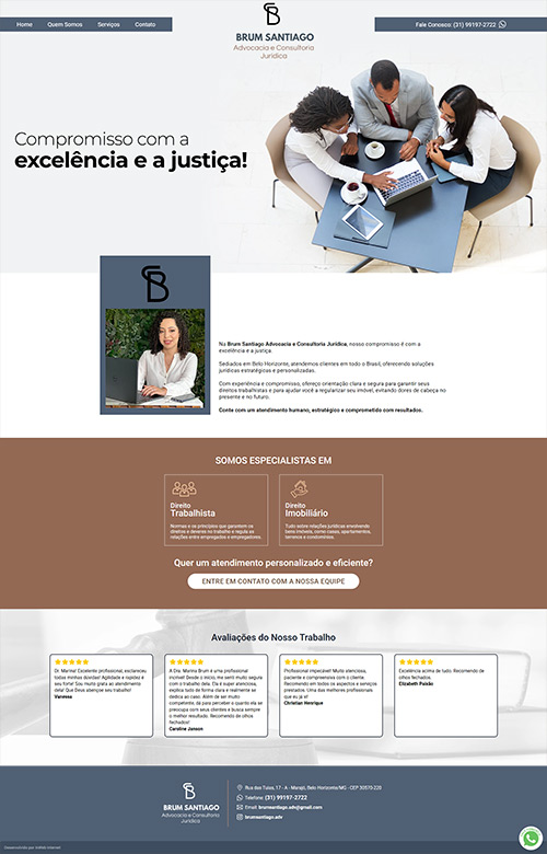 Brum Santiago AdvocaciaEmpresa de advocacia e consultoria jurídica, com base em Belo Horizonte (MG). O site apresenta a empresa, descreve os serviços nas áreas de direito trabalhista e direito imobiliário, além de métodos de contato e mídias sociais.