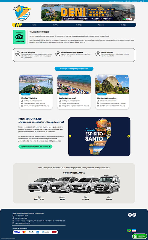Deni TáxiEmpresa de táxi no Espírito Santo, que cobre todo o estado, além de parte do Rio de Janeiro, Minas Gerais e Bahia. O site apresenta a empresa, os serviços oferecidos e promoções, frota utilizada, telefones de contato, além de métodos de contato para cadastramento, orçamento de traslado e agendamento de viagens.