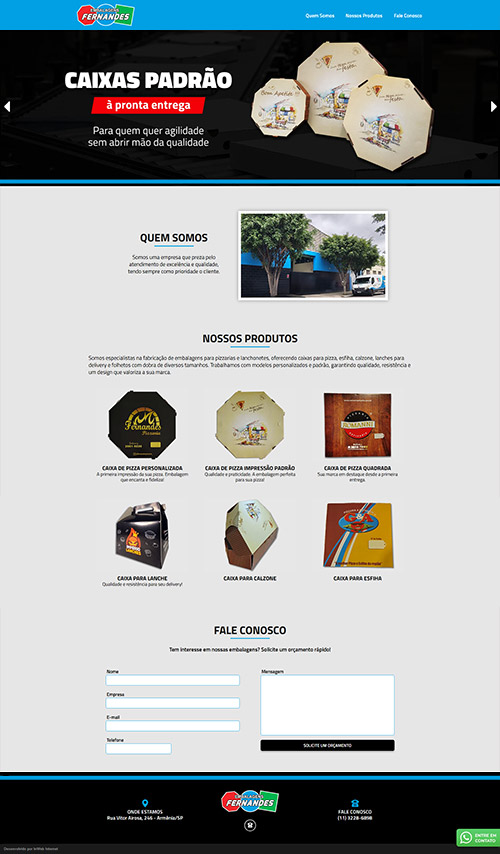 Fernandes EmbalagensEmpresa de Armênia (SP), especializada na fabricação de embalagens para pizzarias e lanchonetes, oferecendo caixas para pizza, esfirra, calzone, lanches, delivery e folhetos. O site apresenta a empresa, os serviços oferecidos, com fotos de amostras dos tipos de produtos, além de métodos de contato.