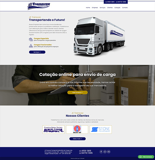 JE TransvazSite desenvolvido em parceria com a Cotiweb Internet. Empresa de Vargem Grande Paulista (SP), especializada em transporte de cargas em São Paulo e Minas Gerais. O site apresenta a empresa, os serviços realizados como cargas especiais e fracionadas, lista de clientes atendidos, além de formulário de cotação e métodos de contato.