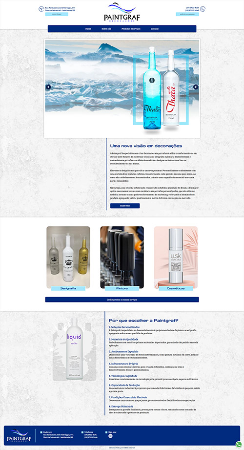 PaintgrafEmpresa de Indaiatuba (SP), especializada em decoração de garrafas para o setor industrial, como embalagens para cosméticos, pintura em cerâmica, copos e taças, craquelada, serigrafia, metalizada, espelhada, fotocrômica, fotoluminescente, entre outras. O site apresenta a empresa, os produtos e serviços oferecidos, além de métodos de contato.