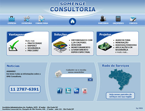 Somenge ConsultoriaEmpresa de São Paulo, capital, focada na prestação de consultoria na área de topografia, geoinformação e geotecnologia. O site apresenta a empresa, sua estrutura, informações sobre consultoria, parceiros, formulários de contato e orçamento. O site foi feito em parceria com a MRS.