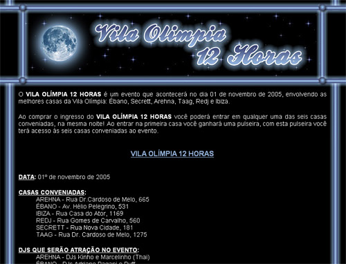 Vila Olímpia 12 HorasEvento especial de casas noturnas da Vila Olímpia (São Paulo) que propiciam a seus participantes ter acesso a todas as casas com um único ingresso e ter acesso a diversos estilos de música diferentes. O evento é gerenciado pela Rádio Energia 97. A InWeb desenvolveu um layout leve e simples e criou uma identidade visual para o evento.